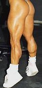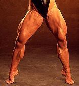 Finally Meg switches to her stomach and hooks the pad behind her ankles. She curls the pad in toward the back of her knees until the muscles in the back of her thighs are bulging and sweating like the front. Then it's weights on her shoulders as she rises up on her toes and the muscles in her calves grow. She doesn't stop until it looks like her calf muscles and veins will burst through the skin. Her ankles are trim and lead to perfectly formed sexy arches and toes. Meg's legs are now solid muscle, skin and veins. In The Black widow her legs were muscular and attractive. Now there is so much muscle Brad is aroused to the point of trembling. And at the same time there is a little fear. He thinks she could kill him.