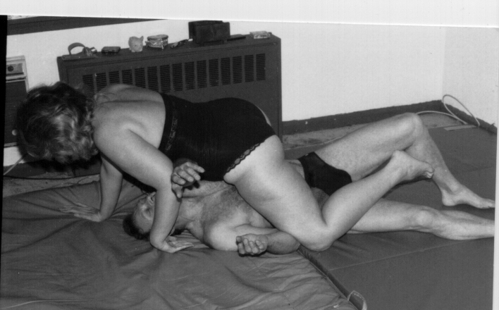 Well, we got to their apartment, still held fast on both sides, and went into a large living room which had wrestling mats on the floor instead of a carpet. I was still so mad at the put downs I had been getting from them that the mats didn't register on me. Pat locked the door with an inside key, and put it away while Gina distracted me my taking her coat off slowly. She then removed her sweats and got down to a bra and panties.