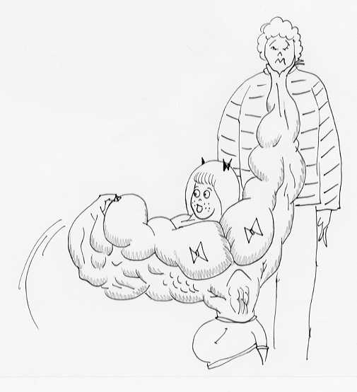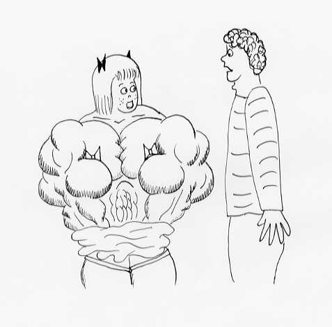 It was as if she were peeling an orange as the tight shirt came over her head. She was now topless except for a pair of bow ribbons she had pasted over her nipples. She did not quite have fully developed breasts yet, but her pecs would be the envy of Mr.Olympia. "You know how much I love working out ...." she continued as she crossed her arms in front of her. " Ya.", he replied, watching, her huge pecs converge to a rippling cleavage. ".... and how much I just love beating up on boys or men", she added, turning to a side chest pose that made Arnold Schwarzenneger look like Pee-Wee Herman. "Well, I thought I could combine the two things I love most together. I've all ready taken care of the workout, now I need to beat up on a male.", she said, looking up at her older brother with flickering eyelashes. For the first time, Brad felt unnerved by his little sister. "Wait a minute, Annie, you don't mean ...?", he asked, backing away nervously. " Uh, huh ", she replied with an ear to ear smile. "But why?", Brad asked as he backed into the door. "Awww... you're my big brother, your supposed to help your little sister out.", she said, throwing her chest out and pinning him to the door. Her pecs felt like steel against his rib cage. "Annie, please", he begged. "I think when a girls got muscles like this, that it's only customary for her to beat up her big brother ... and I wouldn't want to break any traditions.", she said, flexing her massive biceps again. Brad tried to move, but found he was between muscles and a hard place. "Besides, you really don't have a choice in the matter.", Annie said.