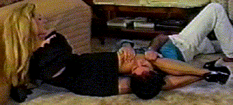 | In a furry, and before I could react, Mrs. Swanson scooped me up onto her shoulders and marched out of the house with me. We were in her home in a matter of seconds but that time outside was humiliating - being carried like a sack of wheat by this thin girl with my manhood wagging back and forth... Once inside she slapped me all over her house. I've never come up against faster hands. I never blocked a single blow and never landed one of my own! My cheeks burned as her hands slapped my face back and forth, over and again! As I ducked and back-peddled, she tripped me onto the couch. |