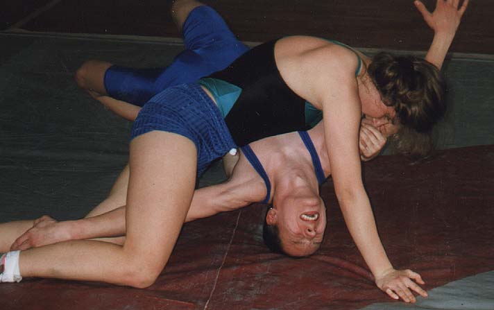 She stepped in and he took her down again, but not for long. In a flash she reversed and was now in control of him! In ten second she mashed his shoulders to the mat and kept them there - not for a three count - but for as long as she wanted! It became evident after five minutes that he was going no place.