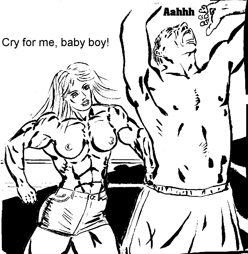 The muscle-bound girl slowly sauntered around the ring, just inside the ropes, eyeing the crowd. "Well!" She announced: "Any of you little boys want to try me?" Sandi flexed her massive biceps. Huge mountains of muscle erupted in her arms. All of the men in her sight began to fidget in their seats. They had seen what those muscles had done to Duke. "How about you, baby?" She asked, pointing to a huge man in the third row. His face went white as a sheet in fear and he tried to sink back in his chair. Sweat broke out on his brow and he began to shake violently. "I guess not." The barechested Amazon laughed as she continued parading around the ring. The females in the arena started laughing and making fun of the men near them.