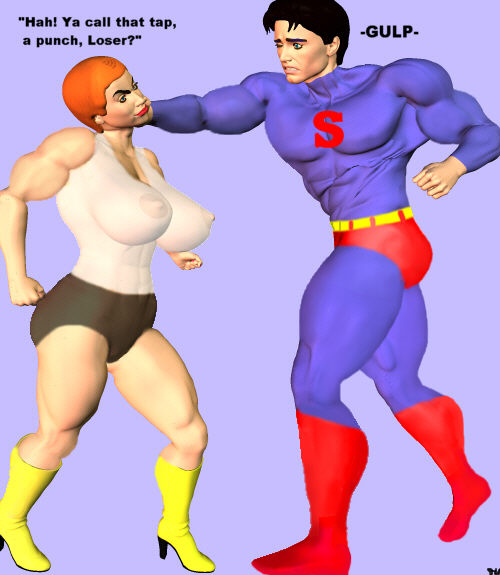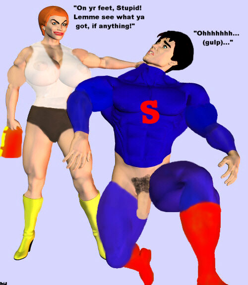 Having once again demonstrated her superiority over the most powerful man in the world, Mala paused an instant to survey her handiwork. His body paralyzed by pain and terror, the mightiest superhero would have fled from the frightening female bully, but Mala, her fist cocked, grabbed the front of his proud uniform. In total terror of that brutal fist, now, he nearly wept, as he croaked in surrender to feminine might.