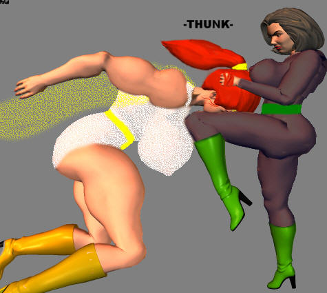 Once free, Athena stumbled to her feet. Her overtaxed limbs trembled so, it was difficult to stand. As Athena tottered shakily, Lilith quickly recovered from her surprise. Furious that her foe escaped, she nailed the faltering goddess with a smashing left fist to her kidneys, and immediately followed it with an even more deadly right.