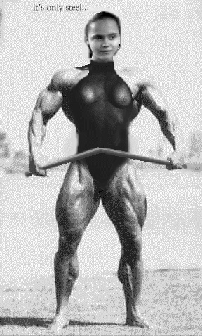She relaxed her entire body, which seemed to swell larger in response. Now for a workout, she thought. She picked up a dumbbell loaded with two 45 lb plates at each end. The 100 lb weight would have been a struggle for her to lift a year ago, but now was like a roll of paper towels to her. Peeling the weights off the ends, she grasped the bar at crotch height and tried to bend it. Ugh..ugh.. this.. is.. hard.. she muttered. But the bar slowly bent in two, screaming in protest as her now swelling arms overpowered the inch-thick steel.