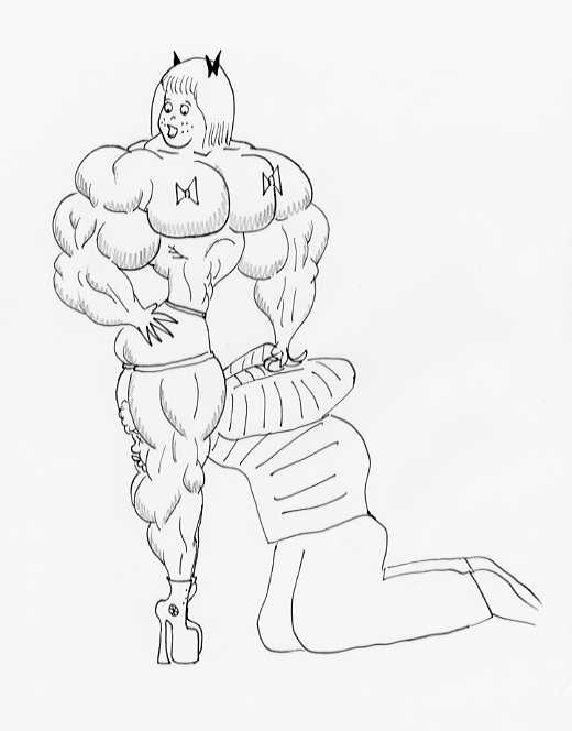 It was as if she were peeling an orange as the tight shirt came over her head. She was now topless except for a pair of bow ribbons she had pasted over her nipples. She did not quite have fully developed breasts yet, but her pecs would be the envy of Mr.Olympia. "You know how much I love working out ...." she continued as she crossed her arms in front of her. " Ya.", he replied, watching, her huge pecs converge to a rippling cleavage. ".... and how much I just love beating up on boys or men", she added, turning to a side chest pose that made Arnold Schwarzenneger look like Pee-Wee Herman. "Well, I thought I could combine the two things I love most together. I've all ready taken care of the workout, now I need to beat up on a male.", she said, looking up at her older brother with flickering eyelashes. For the first time, Brad felt unnerved by his little sister. "Wait a minute, Annie, you don't mean ...?", he asked, backing away nervously. " Uh, huh ", she replied with an ear to ear smile. "But why?", Brad asked as he backed into the door. "Awww... you're my big brother, your supposed to help your little sister out.", she said, throwing her chest out and pinning him to the door. Her pecs felt like steel against his rib cage. "Annie, please", he begged. "I think when a girls got muscles like this, that it's only customary for her to beat up her big brother ... and I wouldn't want to break any traditions.", she said, flexing her massive biceps again. Brad tried to move, but found he was between muscles and a hard place. "Besides, you really don't have a choice in the matter.", Annie said.