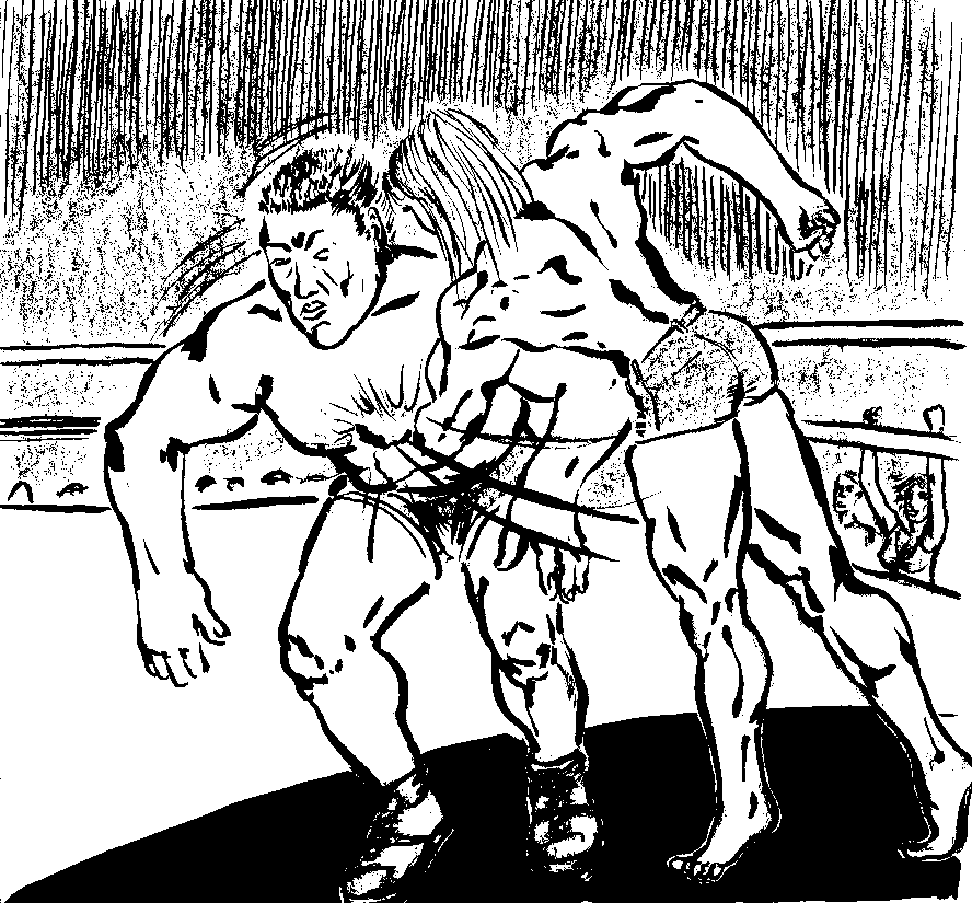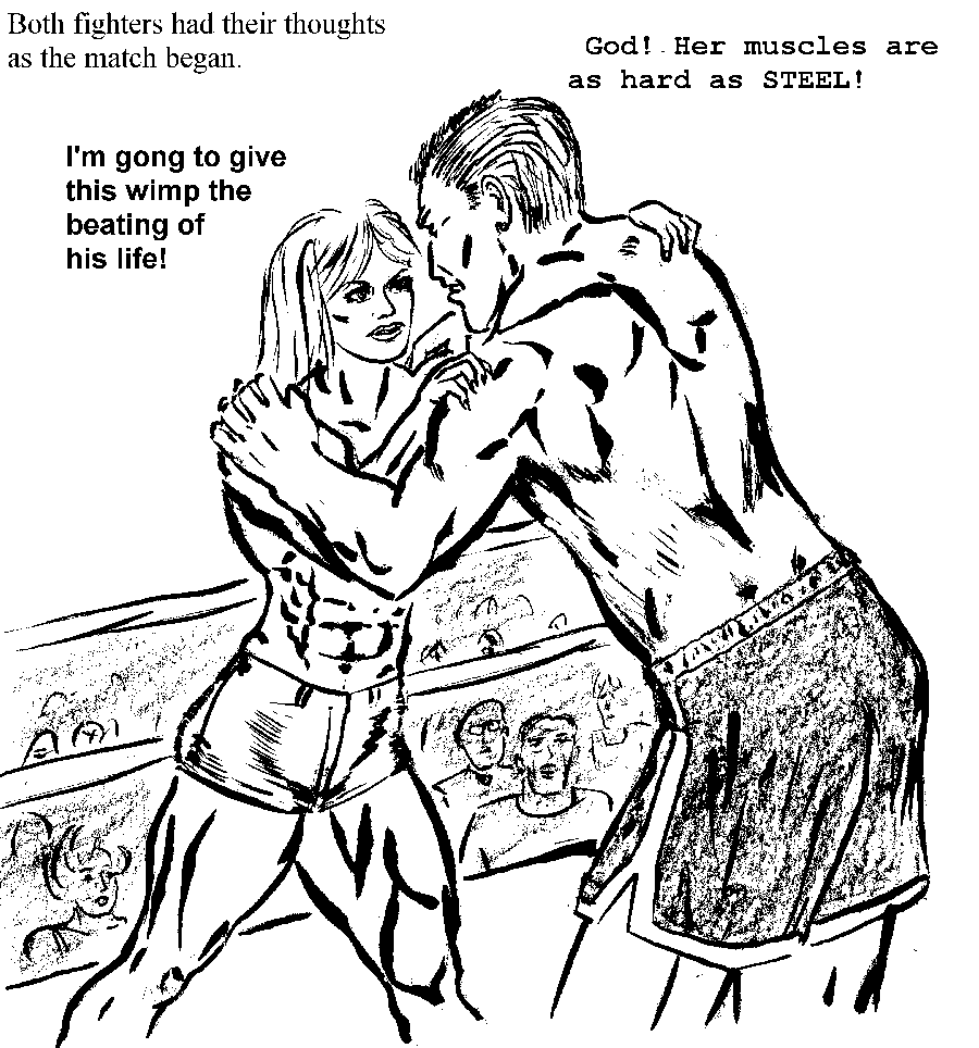 The combatants moved towards each other. Sandi walked straight to the center of the ring. She had her arms hanging by her sides, in total disdain of her much larger opponent. Duke, after being so haughty earlier, sidled cautiously forward. His hands were up in a defensive posture. The crowd was screaming in anticipation as the two fighters neared each other. Duke reached for Sandi's shoulders in the classic wrestling hold that starts most matches. The girl reached up and grabbed his shoulders also. "Damn!" He whispered involuntarily as he felt the size, and moreover, the incredible hardness of the girl's deltoids. It was his first shock of the fight. It was not his last by any means.