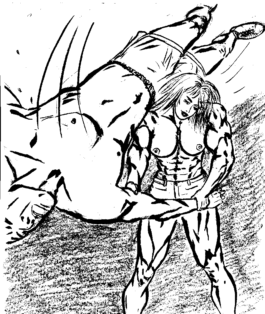 The brutal girl drug her much larger victim to the middle of the ring. The fight had long since been beaten out of him. He was just a shell of his former self. His torso was a mass of bruises and welts. His face showed obvious signs of punishment. Eyes blackened and nose smashed. Sandi's beautiful face was unmarked as well as her iron body. The girl's muscles bulged hugely, the battered man a testament to her strength and superiority.
