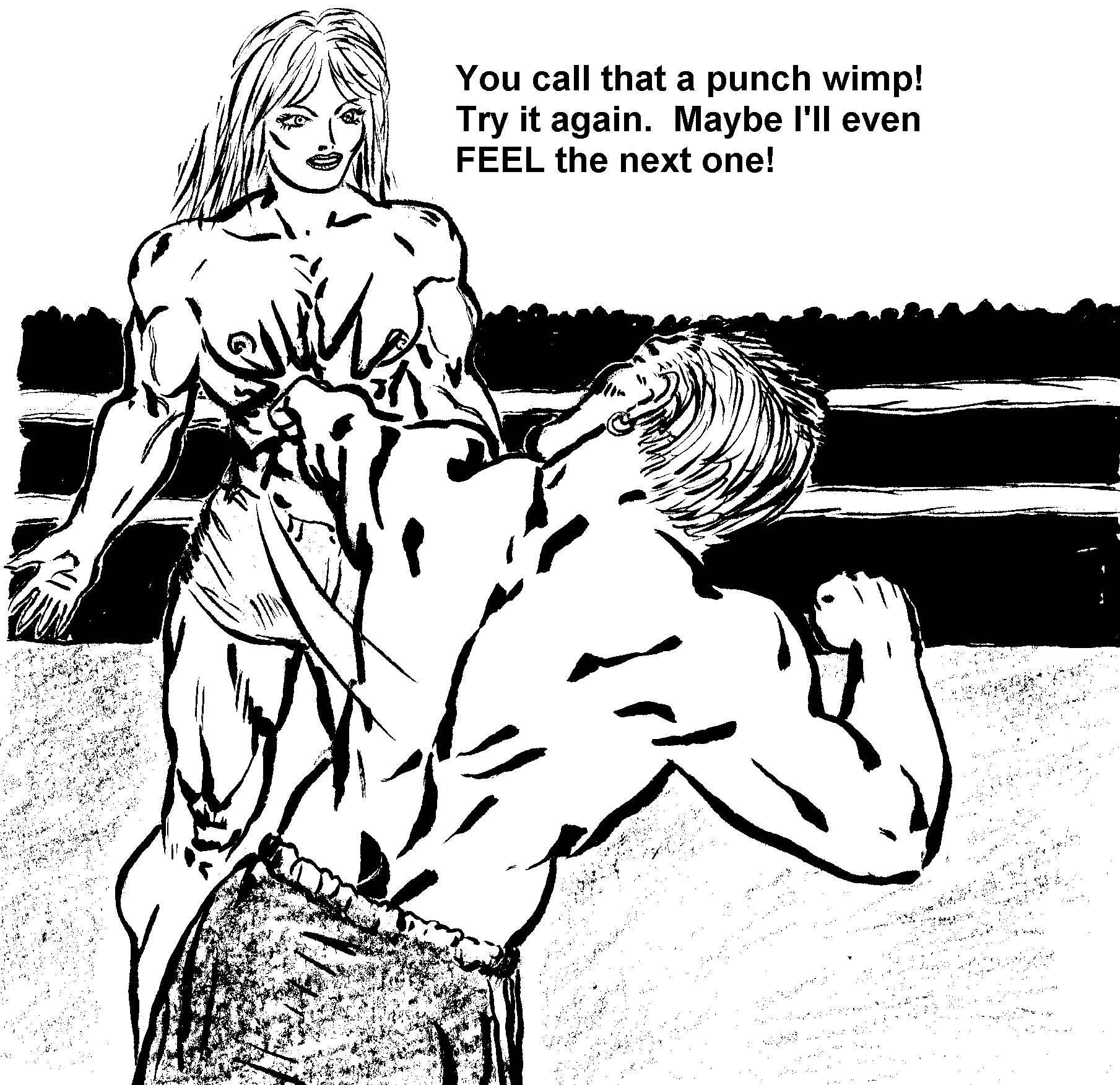 "And this!" The Amazon ripped a staggering left into his ribs. "Oooaa.... Oooaa..." The big man cried as Sandi's fist crashed into his yielding flesh. "But, you know something, sweetcheeks? I can hit a LOT harder than that. Here's a sample!"
