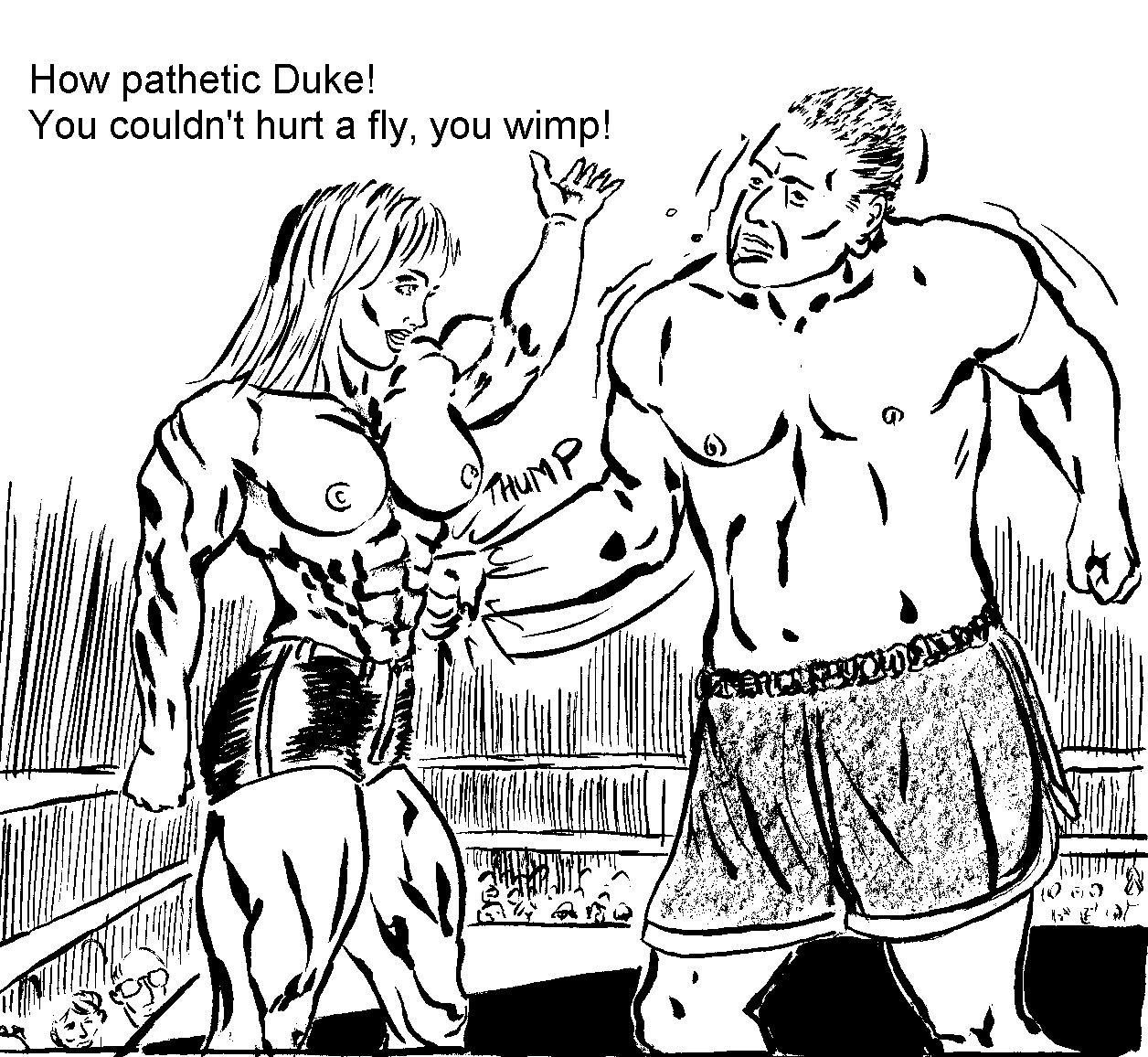 Sandi paraded around the ring flexing her massive biceps while Duke whimpered in pain on the mat. The women in the crowd were going crazy; high fiving each other and chanting: "More... More... We want more!" The man-beater lifted Duke's two hundred plus pounds to his unresponsive feet. "They want more, baby boy! So do I!" She said, easily holding him upright. The girl let go of him and buried her left fist into his gut.