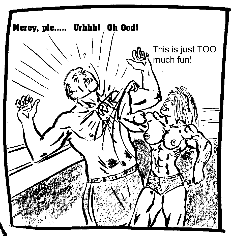 The beautiful girl's massively pumped up triceps propelled her right fist deep into Duke's bruised belly. The incredible force of her punch violently expelled the breath from the mans lungs with a whoosh. Duke couldn't even cry out due to his lack of air. The two hundred forty pound man's legs gave out and he slumped against the buxom female. Sandi held him upright against her sculpted body. "Oooo baby! That felt sooo good!" She taunted in a grotesque parody of sex. "Was it good for you too!" She released her grasp and Duke slumped to the mat.