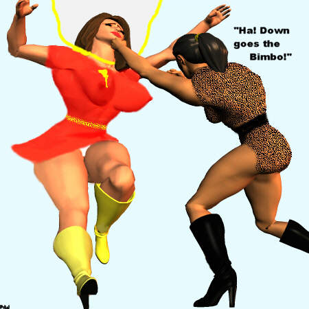 The ancient Wizard's two protégées, the one ancient, the other modern, were equally endowed with divinely granted, super powers. Our sweet Mary was larger than her foe, and more muscularly athletic, but Eve spent three thousand years in tedious boredom, with nothing to do, but hone her martial arts skills to a razor's edge. Now, three thousand years of resentful, pent-up venom exploded in fury at the beautiful young woman, she considered the usurper of her rightful prerogatives.