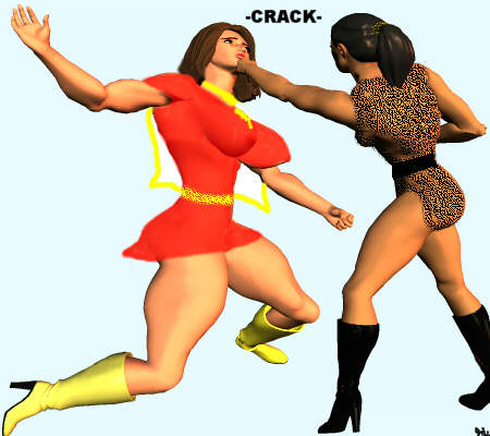 The more frantically poor Mary struggled, the more securely the skillful Eve pinned her to the ground, as she relentlessly smacked the World's Mightiest Girl's head from side to side, with devastating blows, that nearly snapped her slender neck.