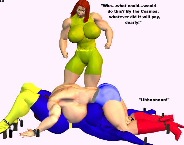 Groggily caught off guard by the crafty, if unorthodox, maneuver, Green Goddess reacted with furious indignation, as the impudent blonde settled herself comfortably on her broad, brawny shoulders.