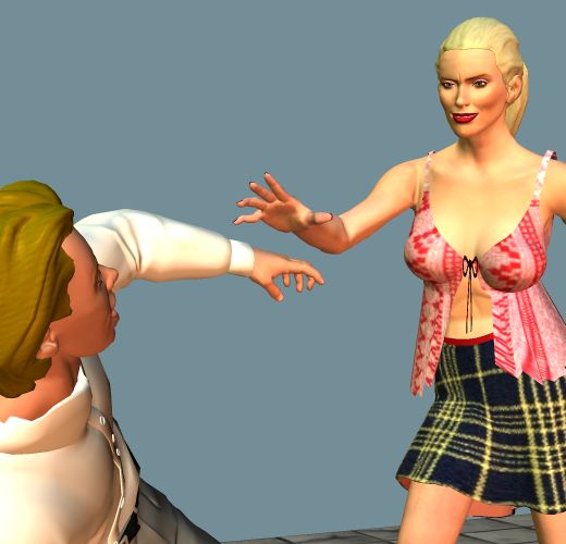 "Well, I am waiting", she put her arms on her hips. That made her seem even bigger. By that time the other kid's emptied the room and once again they were left one on one.